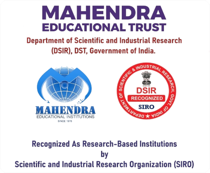 The Mahendra Educational Trust was established in the year 1978 by Shri. M. G. Bharath Kumar, a renowned educationist with an object of imparting a high standard of education to rural children. The trust is located at Kalippatty - midway between Salem and Tiruchengode. Thiru. M.G. Bharath Kumar, the Chairman of the Trust is assisted by the Governing and Advisory Council in matters of Policy, Planning and Development of the Institutions. Tmt. Valliyammal Bharath Kumar, a best teacher awardee, is the Secretary of the Trust. Thiru Ba. Mahendhiran, a young and dynamic engineer, is the Managing Director.