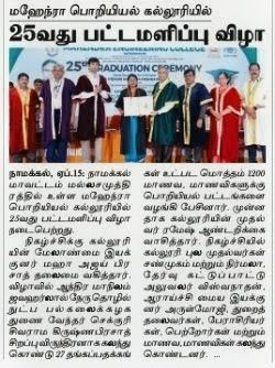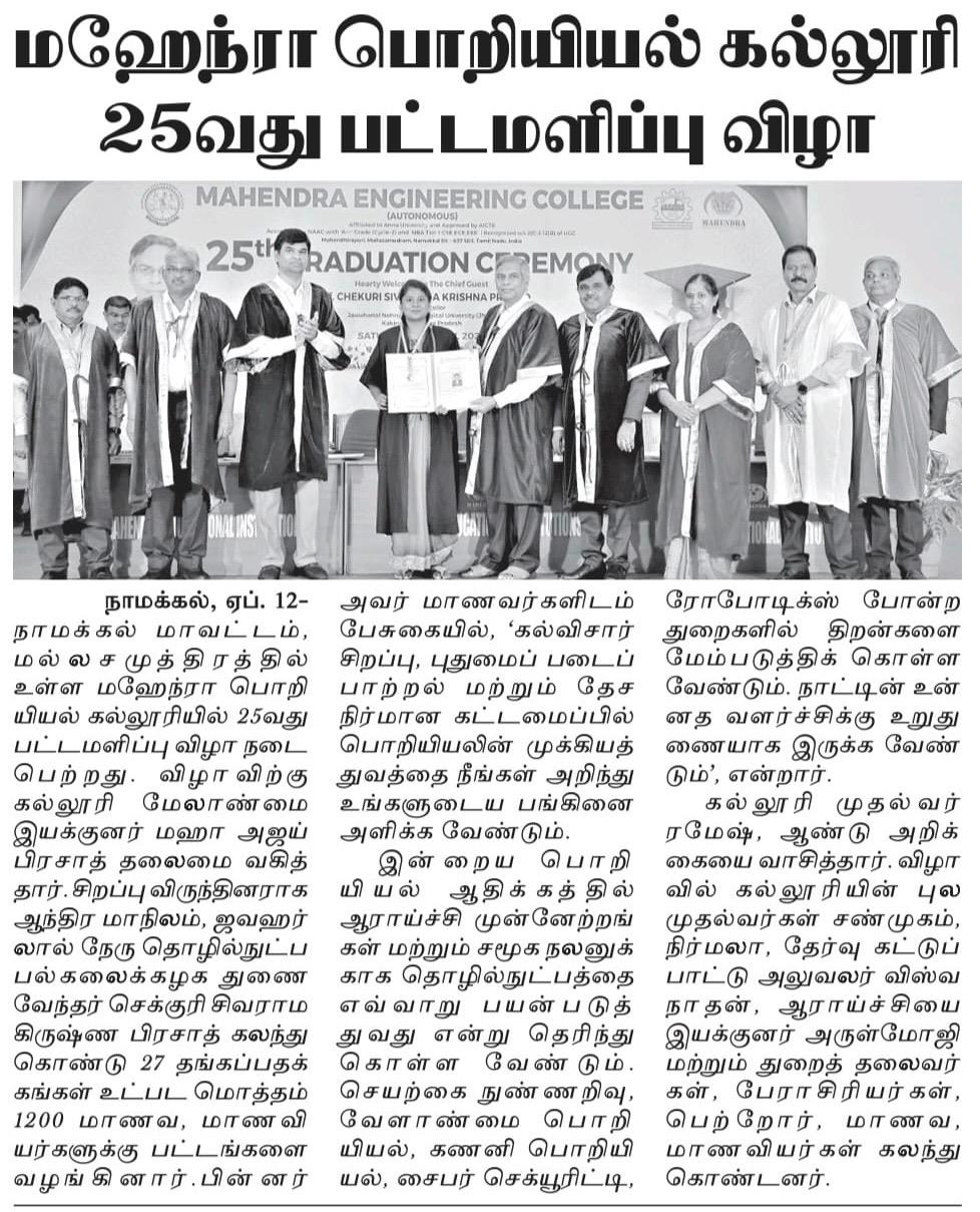 மஹேந்திரா பொறியியல் கல்லூரியின் 25வது பட்டமளிப்பு விழாவில், 1200க்கும் மேற்பட்ட மாணவர்கள் பட்டம் பெற்றனர். இவ்விழாவில் தலைமை விருந்தினர்கள் மாணவர்களை பாராட்டி, அவர்களின் எதிர்கால முன்னேற்றத்திற்கு வாழ்த்துகளை தெரிவித்தனர். இந்த நிகழ்வு மாணவர்களின் கல்வி பயணத்தில் முக்கியமான கட்டமாக அமைந்தது.